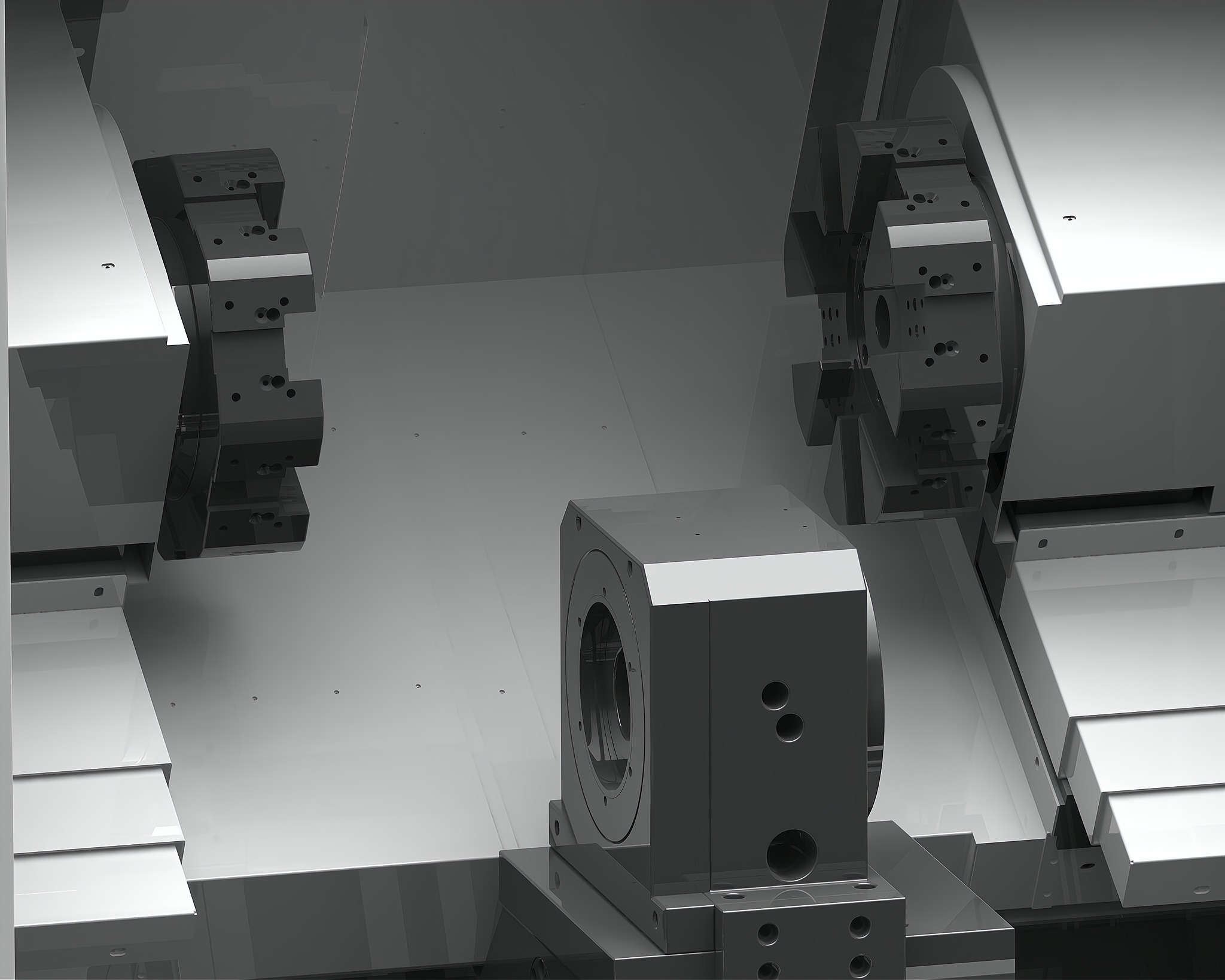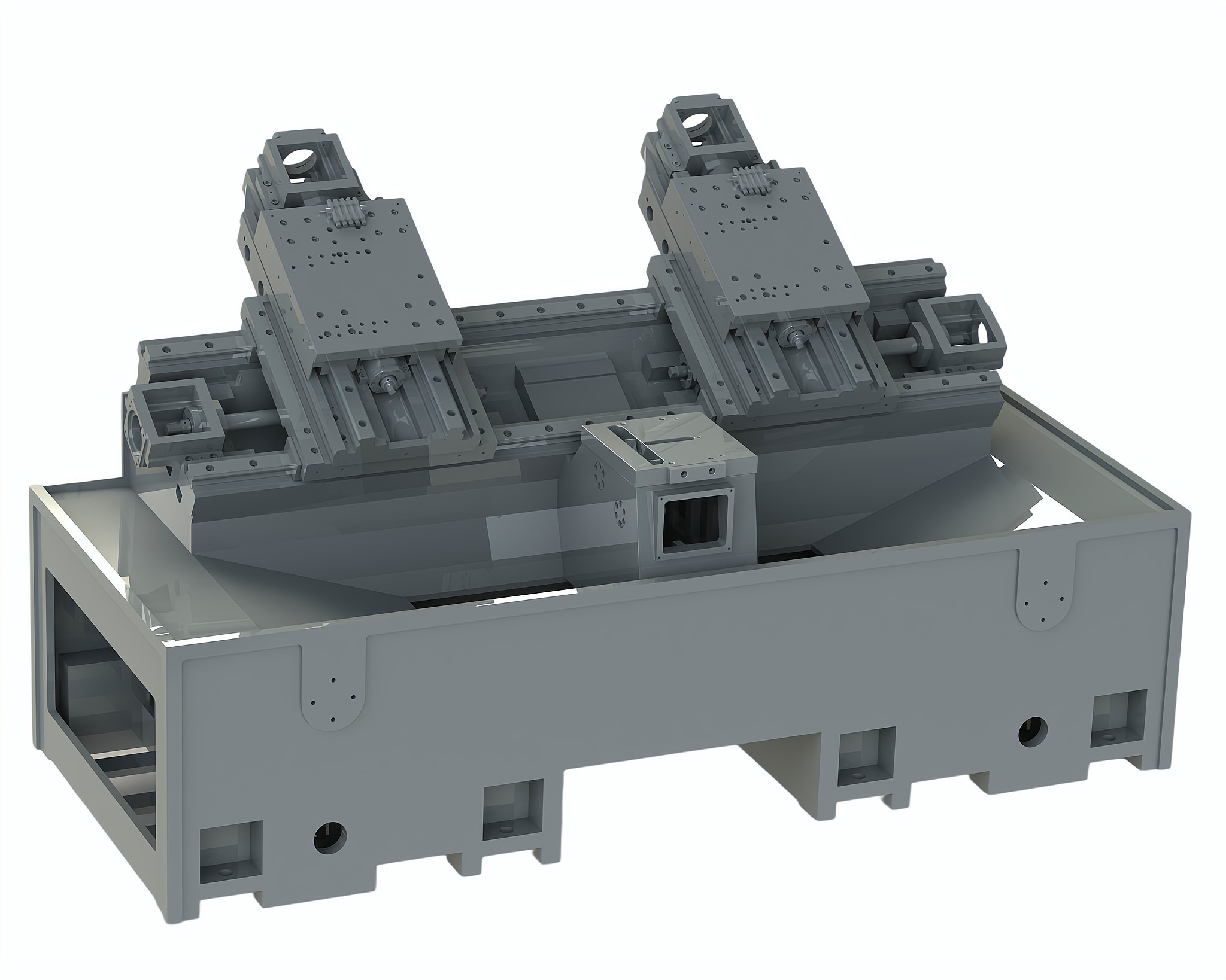 左右刀架為伺服刀塔,分布于主軸箱兩側(cè),為對稱結(jié)構(gòu);