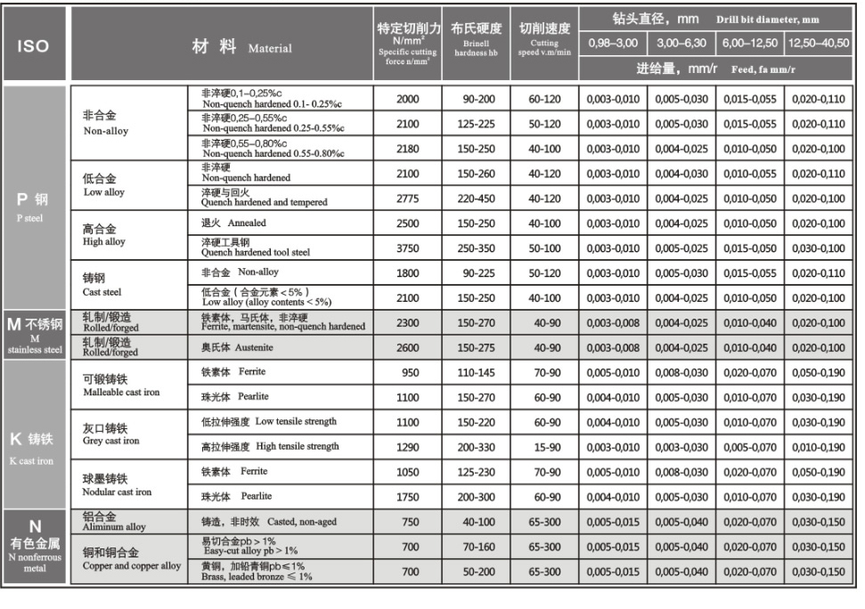 切削用量的選擇與切削過程以及切屑的行程有關,同時也與被加工零件材料、精度要求和機床特性有關。 1切削速度 切削速度主要取決于刀具材料,受到鉆頭耐用度和機床轉速的限制。目前,高速鋼槍鉆一般取切削速度V為35-70m/min; 2進給量 進給量主要受工藝系統(tǒng)(刀具、工件和機床等)剛度和強度的限制。此外,還受到加工表面質量、排屑效果和切削液的性質等因素的影響。目前,高速鋼槍鉆常取f為0.01-0.032mm/r,直徑大者取上限。 槍鉆切削參數(shù)參考下表:
