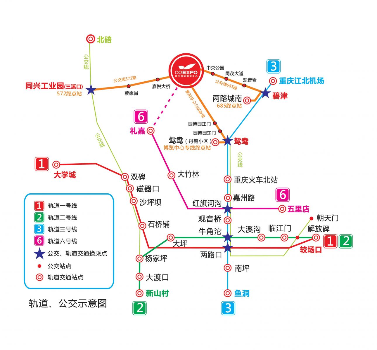 重慶火車站(菜園壩)請在兩路口站乘座輕軌3號線(江北機場方向)至(軌道鴛鴦?wù)?出站換乘國博中心專線;