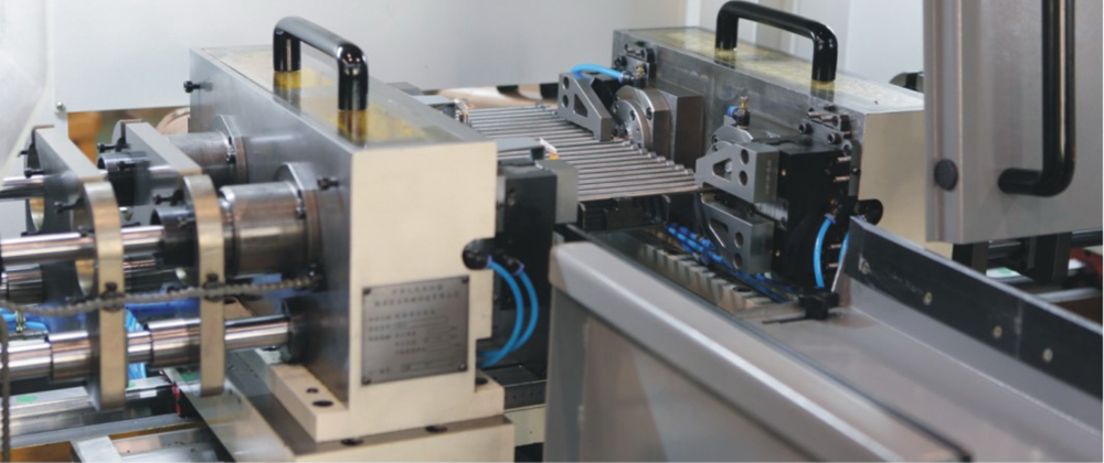 該機(jī)床采用四軸對(duì)進(jìn)式加工,進(jìn)口氣動(dòng)自定心求心夾具裝夾,通過(guò)一次安裝即可完成高精度臺(tái)階孔的加工,并具備極高的入口位置精度。機(jī)床自動(dòng)上料機(jī)構(gòu)單次最大安裝工件數(shù)量為22只,極大縮減了機(jī)床加工的輔助時(shí)間,效率極高。其一個(gè)加工循環(huán)的時(shí)間跨度合理,便于工廠進(jìn)行人員及生產(chǎn)安排,并大幅降低了工人勞動(dòng)強(qiáng)度。