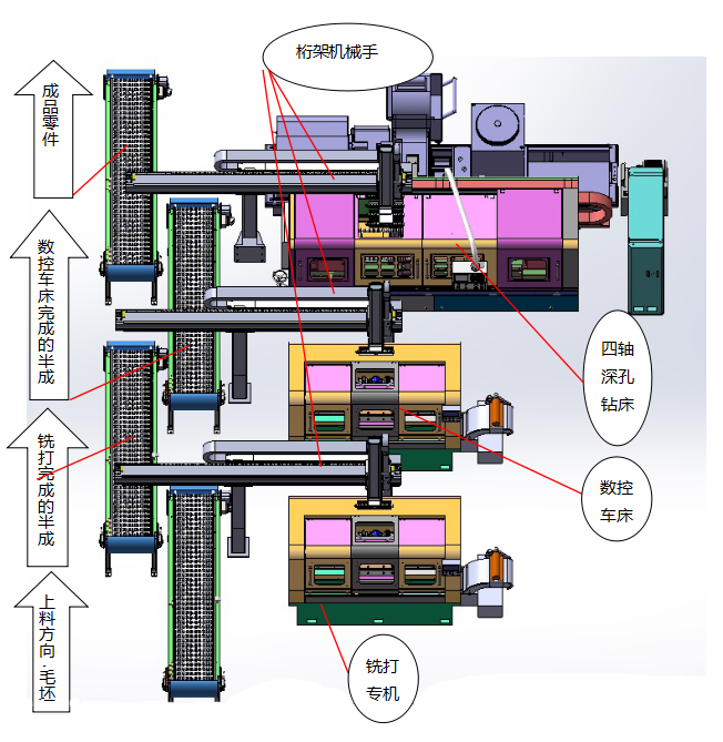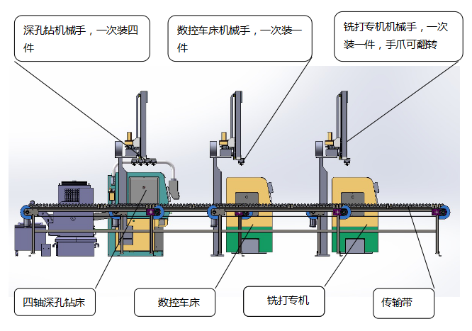 該生產(chǎn)線,將凸輪軸銑打兩端頭專機(jī)、數(shù)控車床專機(jī)和深孔鉆機(jī)床有機(jī)結(jié)合,共用一條桁架機(jī)械手裝卸工件。成流水線式排列。三道工序組成一個(gè)加工模塊,工序間的物流轉(zhuǎn)移都由桁架機(jī)械手完成。使凸輪軸粗加工效率發(fā)揮至最大,人工降至最少。提高了加工效率,降低了生產(chǎn)成本。